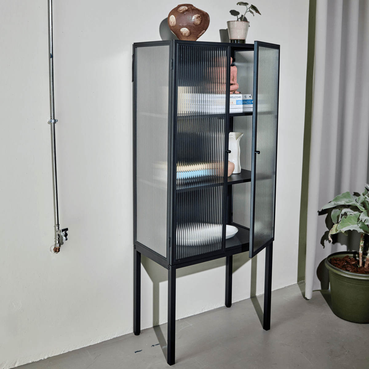 House Doctor Cabin kapp on valmistatud mustast metallist. Klaasist uksed on karastatud klaasist, mis loovad peene efekti.